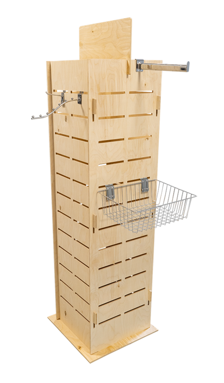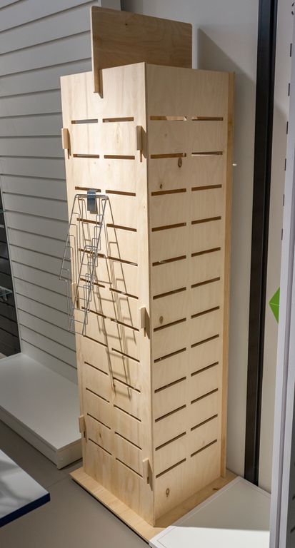 Универсальный фанерный стеллаж. Сборка без гвоздей и клея позволяет легко и быстро установить этот стеллаж в любом помещении. Имеется возможно установки кронштейнов и корзин для товара. Натуральный цвет дерева создает теплую и уютную атмосферу.
