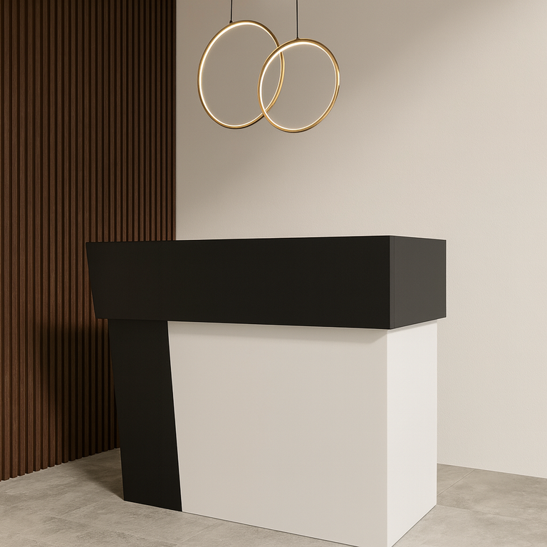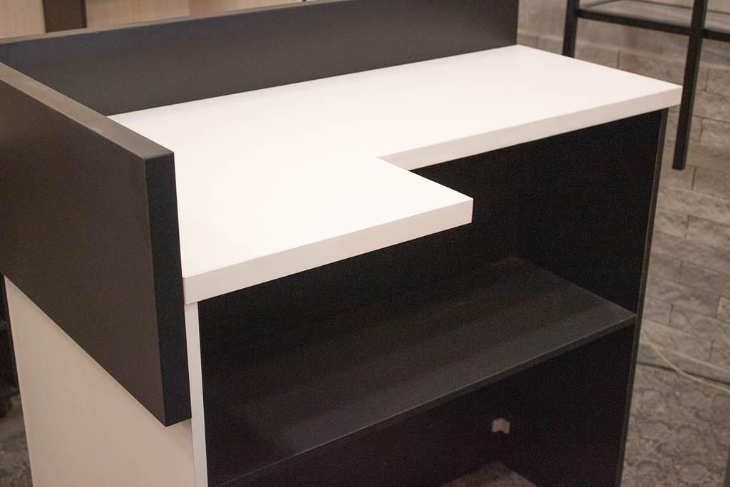 Стильный угловой ресепшен "Сварникел" — мебель, с которой начинается впечатление о вашем бизнесе. Чёрно-белое сочетание смотрится строго, современно и легко вписывается в любой интерьер — от строгого офиса до креативного салона.
