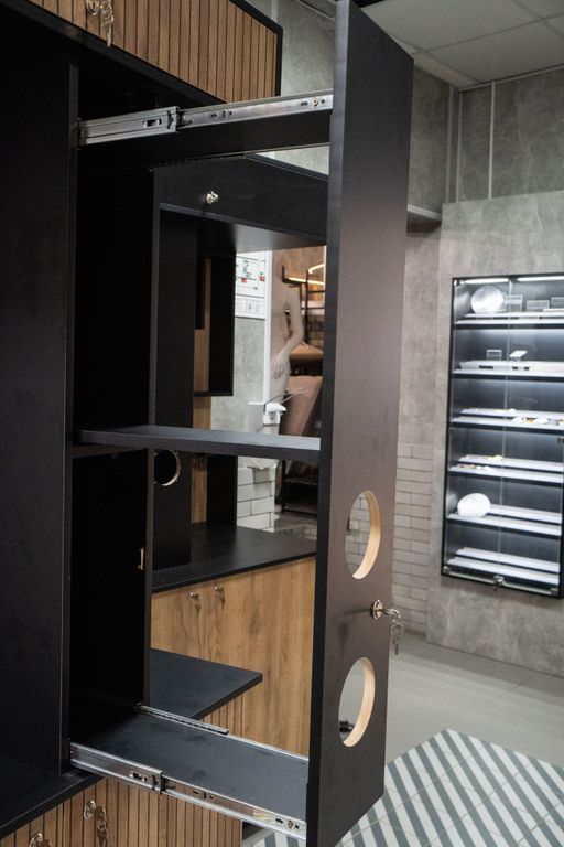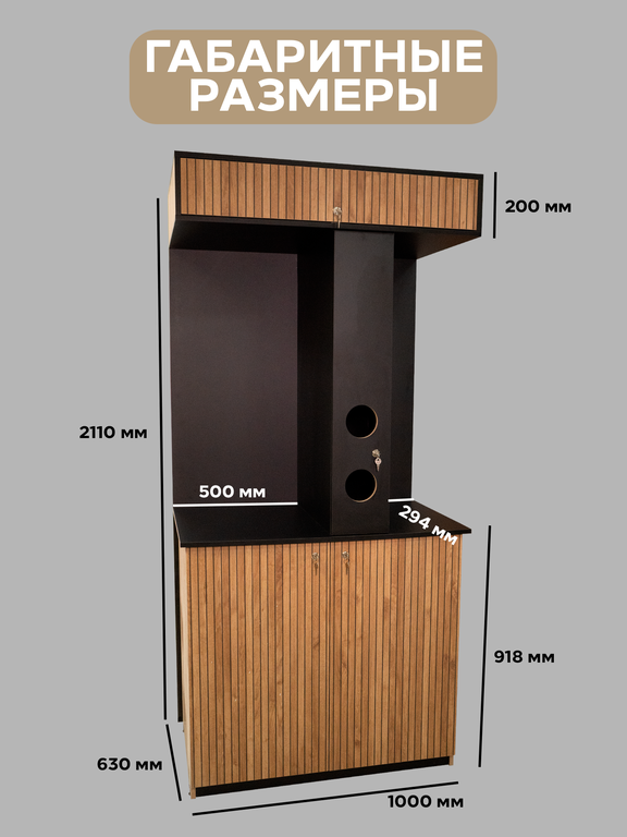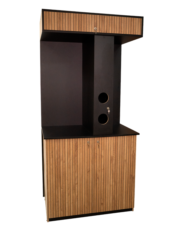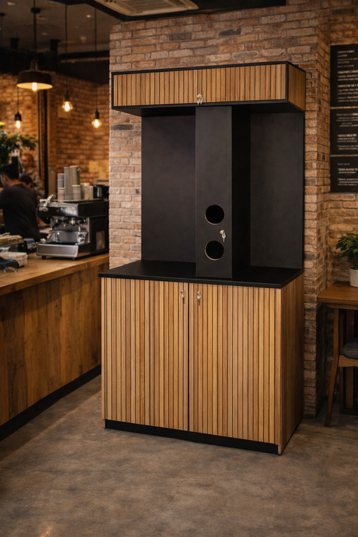 Нижняя закрытая тумба даёт место для хранения запасов: упаковок стаканов, салфеток, упаковки, сахара, инвентаря. Дверцы скрывают содержимое, сохраняя аккуратный внешний вид, что особенно важно для небольших кофе-точек.